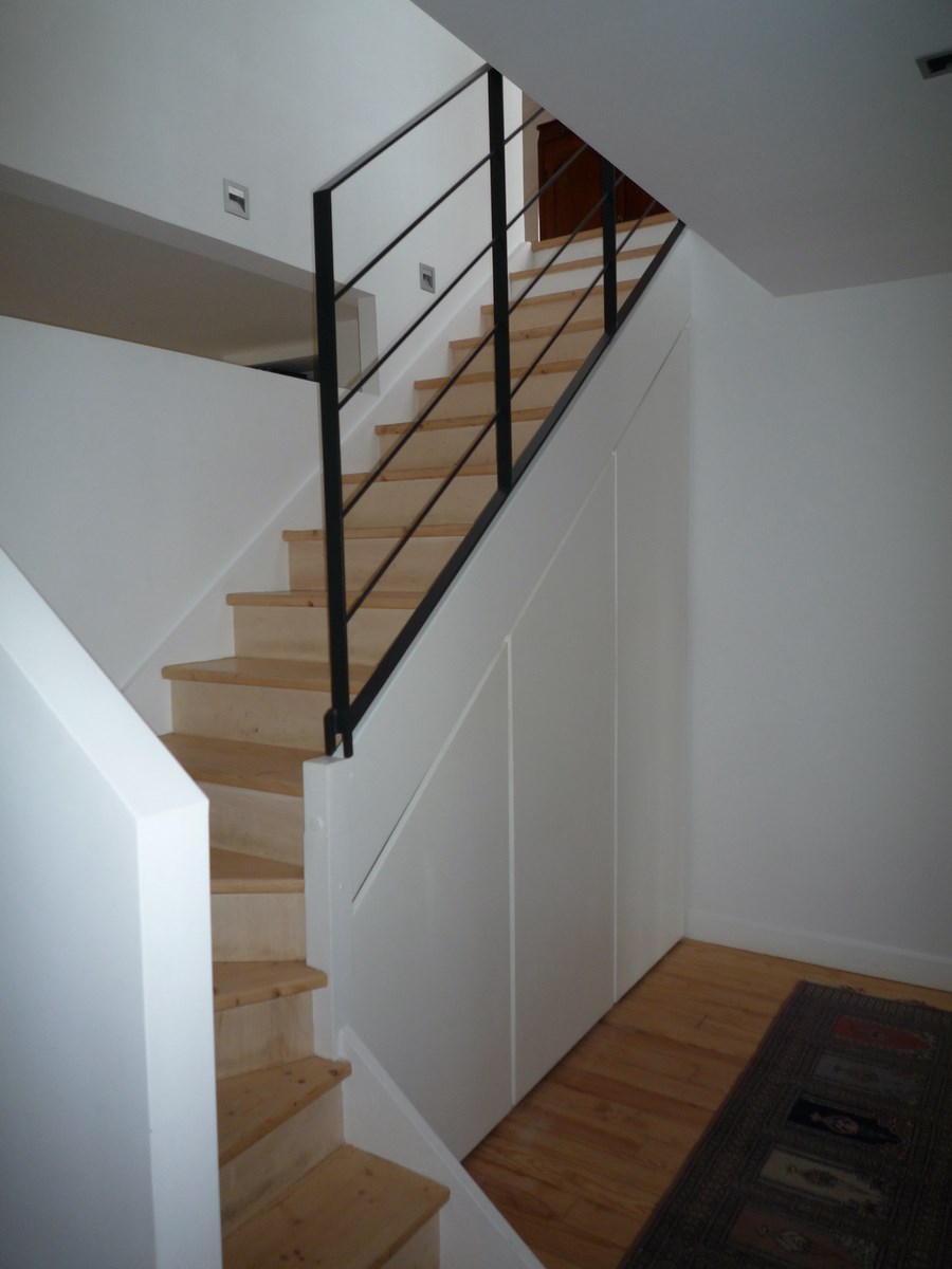 A droite : modification du palier, fabrication d’un bureau sur mesure, rambarde métallique.